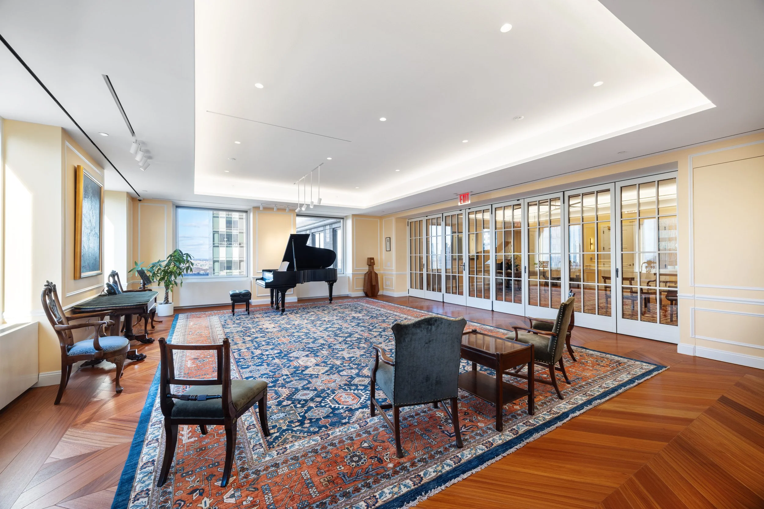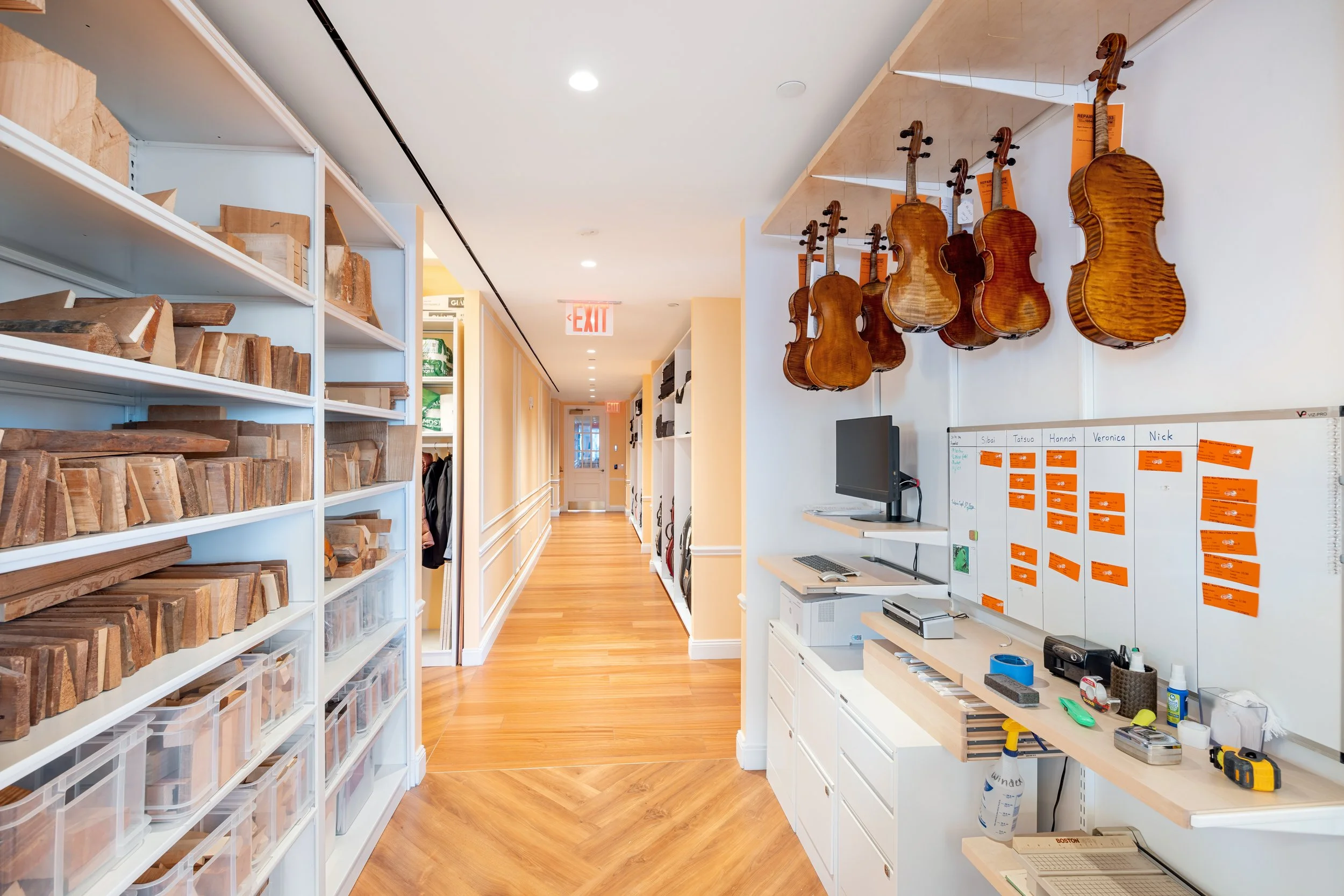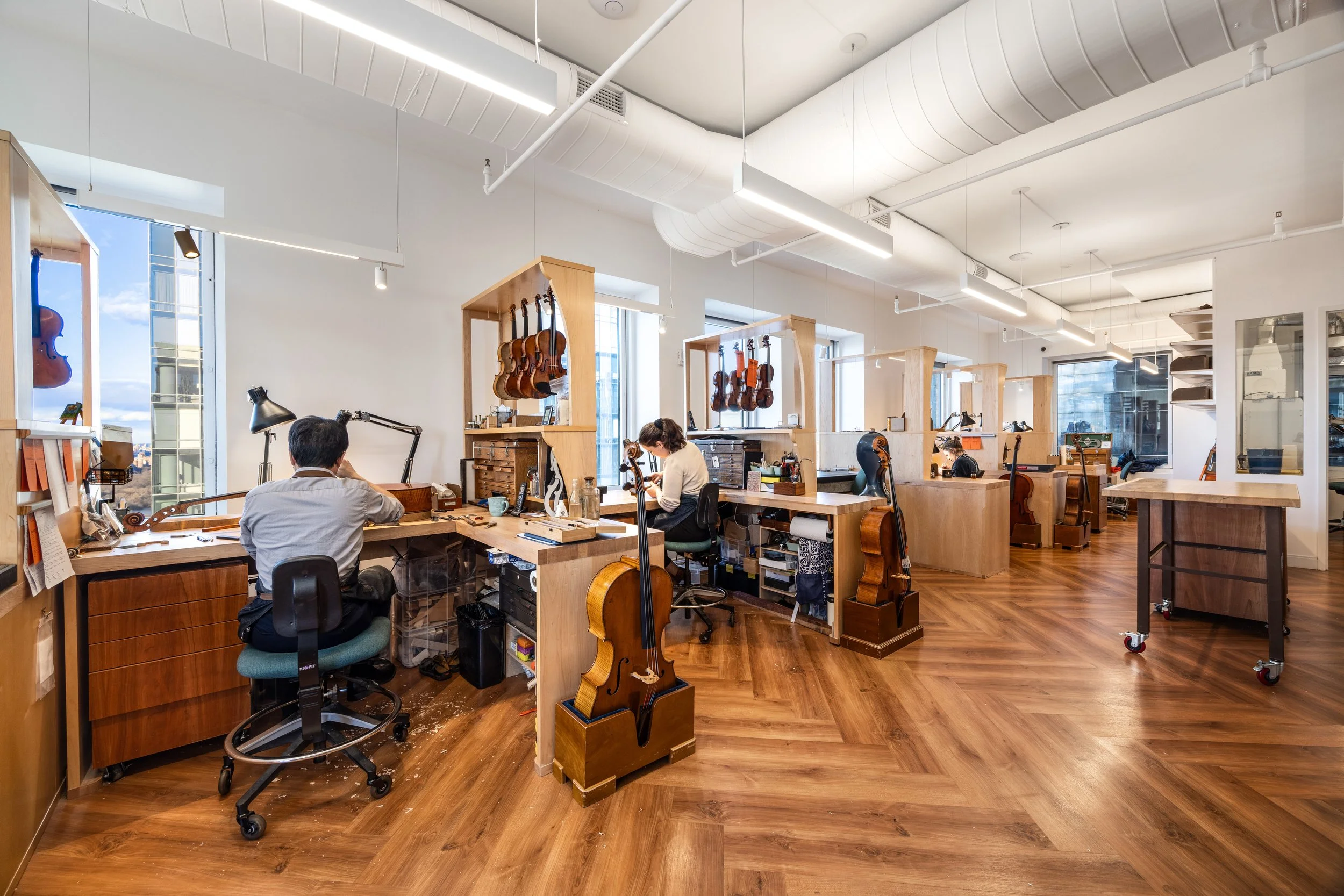 The design was developed to accommodate three distinct program elements within a single floor: a workshop environment for hands-on violin restoration, a dedicated performance area, and an open office layout. Each space required a tailored approach and an experienced hand to execute.